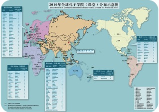 2004年11月21日,第一家孔子学院在韩国汉城(2005年更名为首尔)挂牌成立至今,中国已在105个国家(占世界人口86%)建立了350多所孔子学院,500个中小学孔子课堂,35个国家和地区将汉语教学纳入本国国民教育体系,还有70多个国家的400 多个机构强烈要求成立孔子学院,将汉语作为第二语言学习的人数也已经超过1亿,孔子学院的覆盖面已十分宽广(参见下图)。